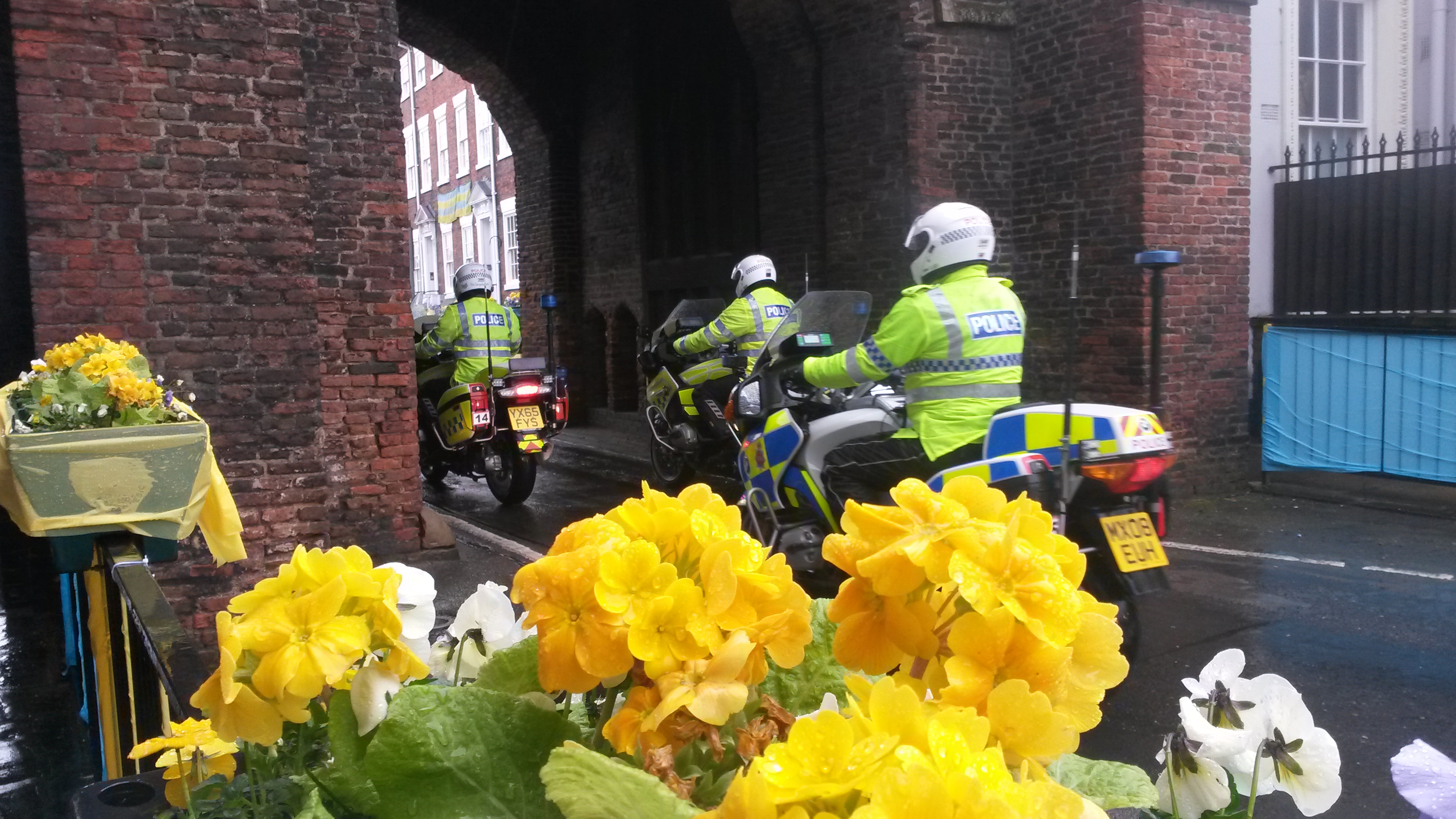 My camera phone was quickly drenched taking photos of the police motorcade at “North Bar Within”, the iconic archway into Beverley.