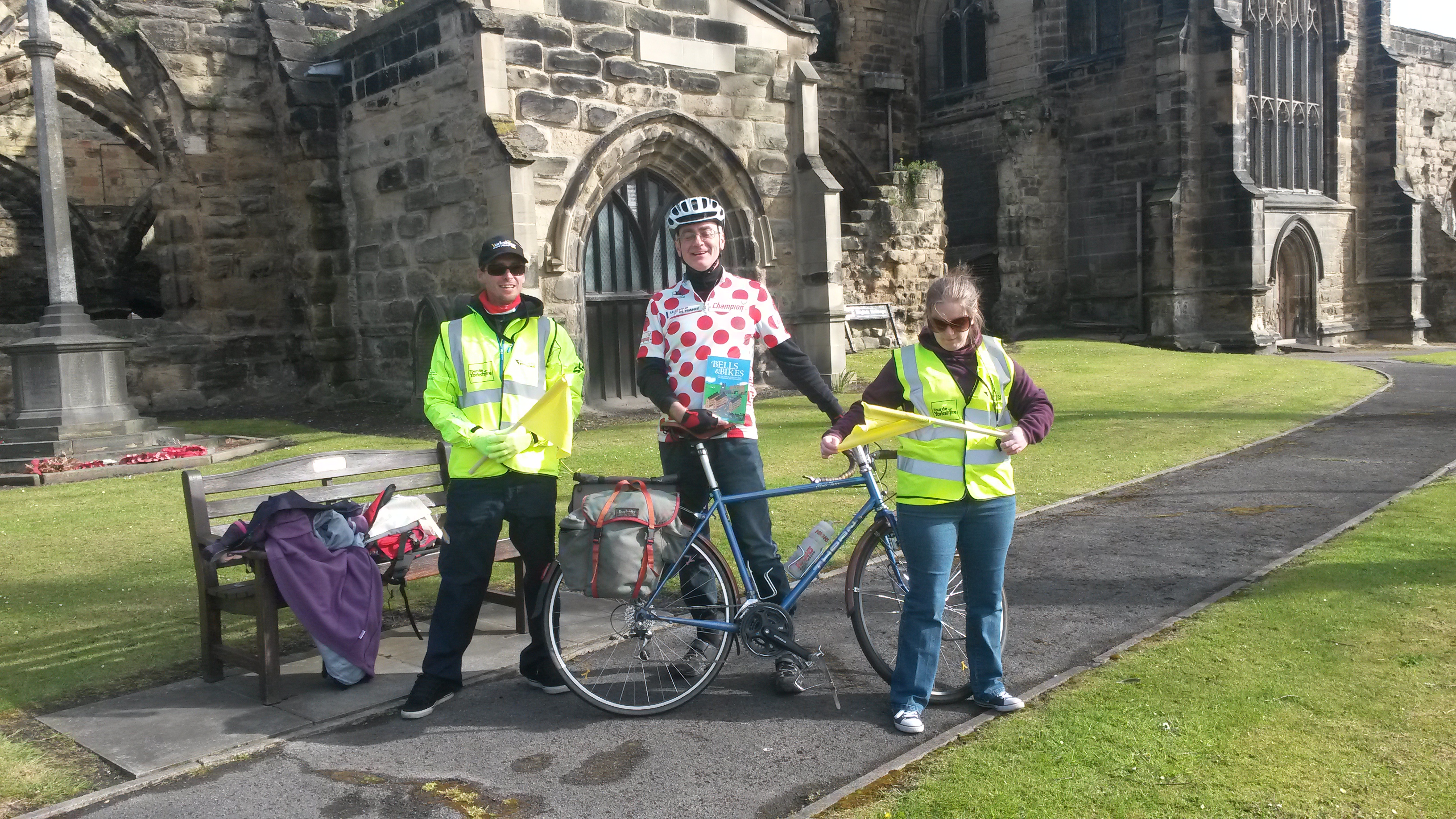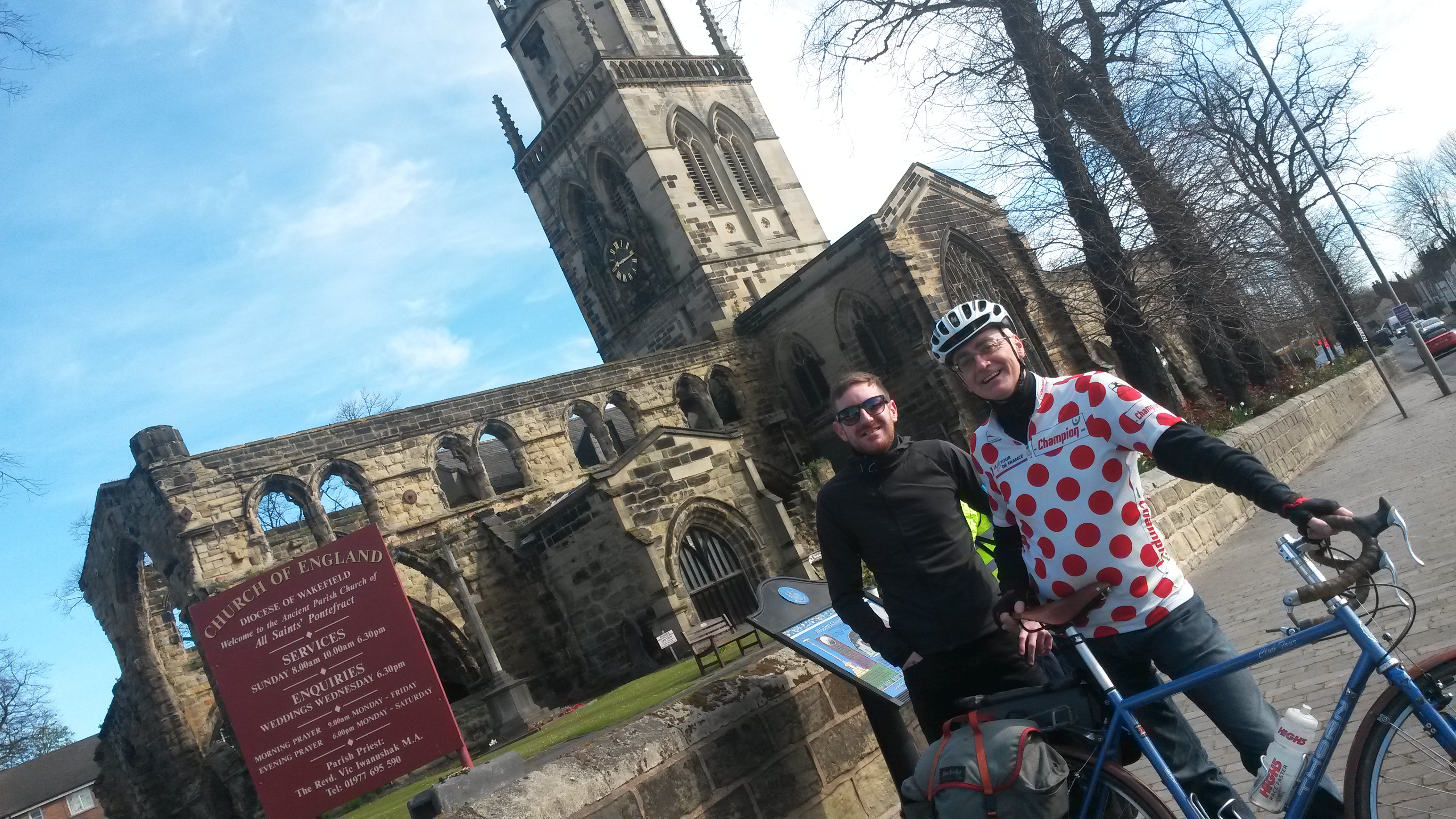 I met James and Joanne in the churchyard at All Saints. They were getting ready for their roles as Tourmakers and Marshalls. Photos were essential. Then in dialogue with a bloke on the pavement we realised we followed each other on Twitter. Bells and Bikes meets Yorkshire Reggiie. Great chat about cycling and then a quick climb to the summit in Pontefract and a spin in polka dots.