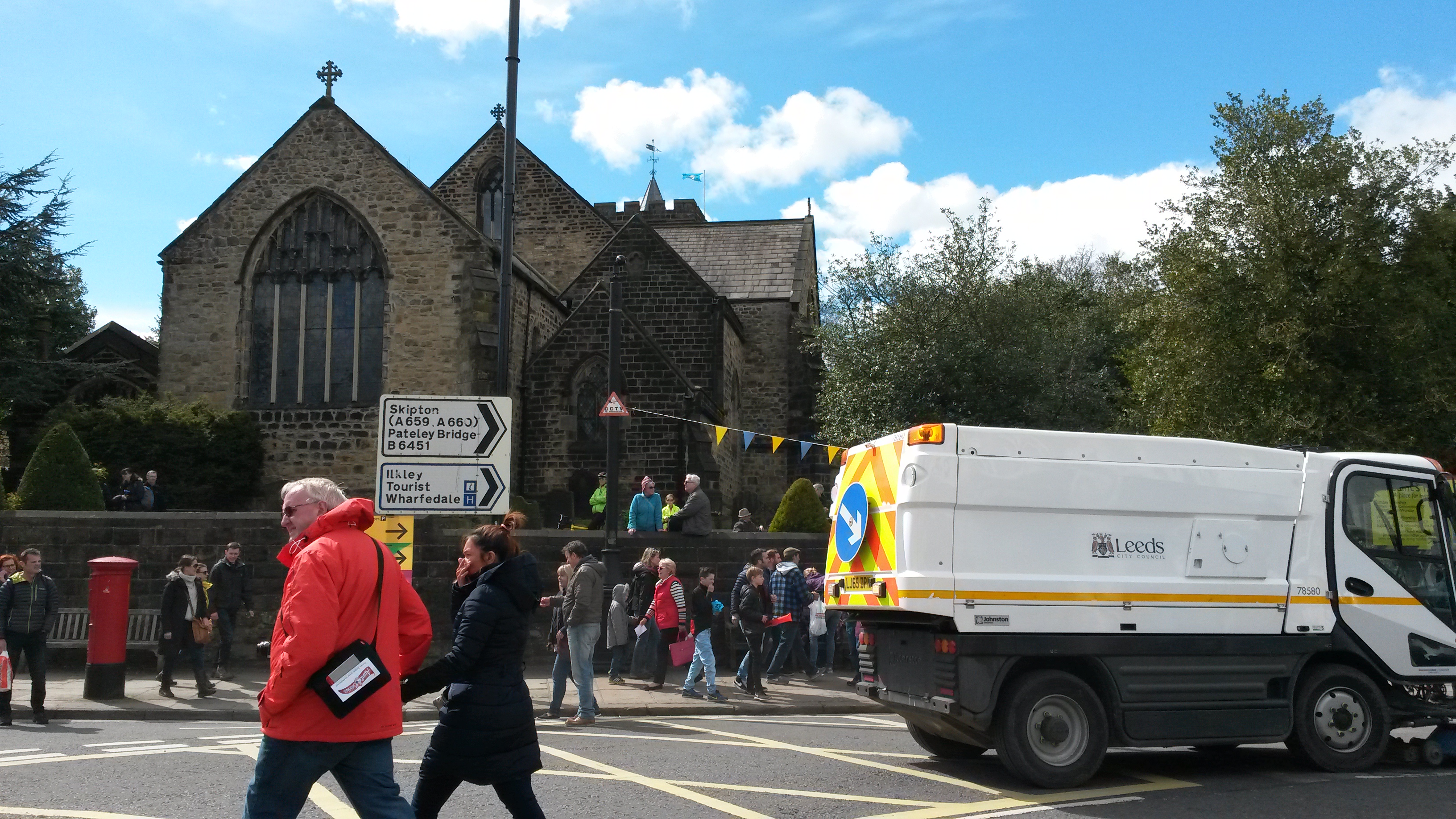 I parked in Leathley, a small village about 4 miles from Otley, with a church which rang for the Tour de France Opening Ceremony. I loaded all 4 panniers onto my bike (2 front and 2 back) and proceeded to tweet my way into Otley with 27 books on board. I cheered the families at their picnic tables as I cycled along and they cheered me. Just like the race.