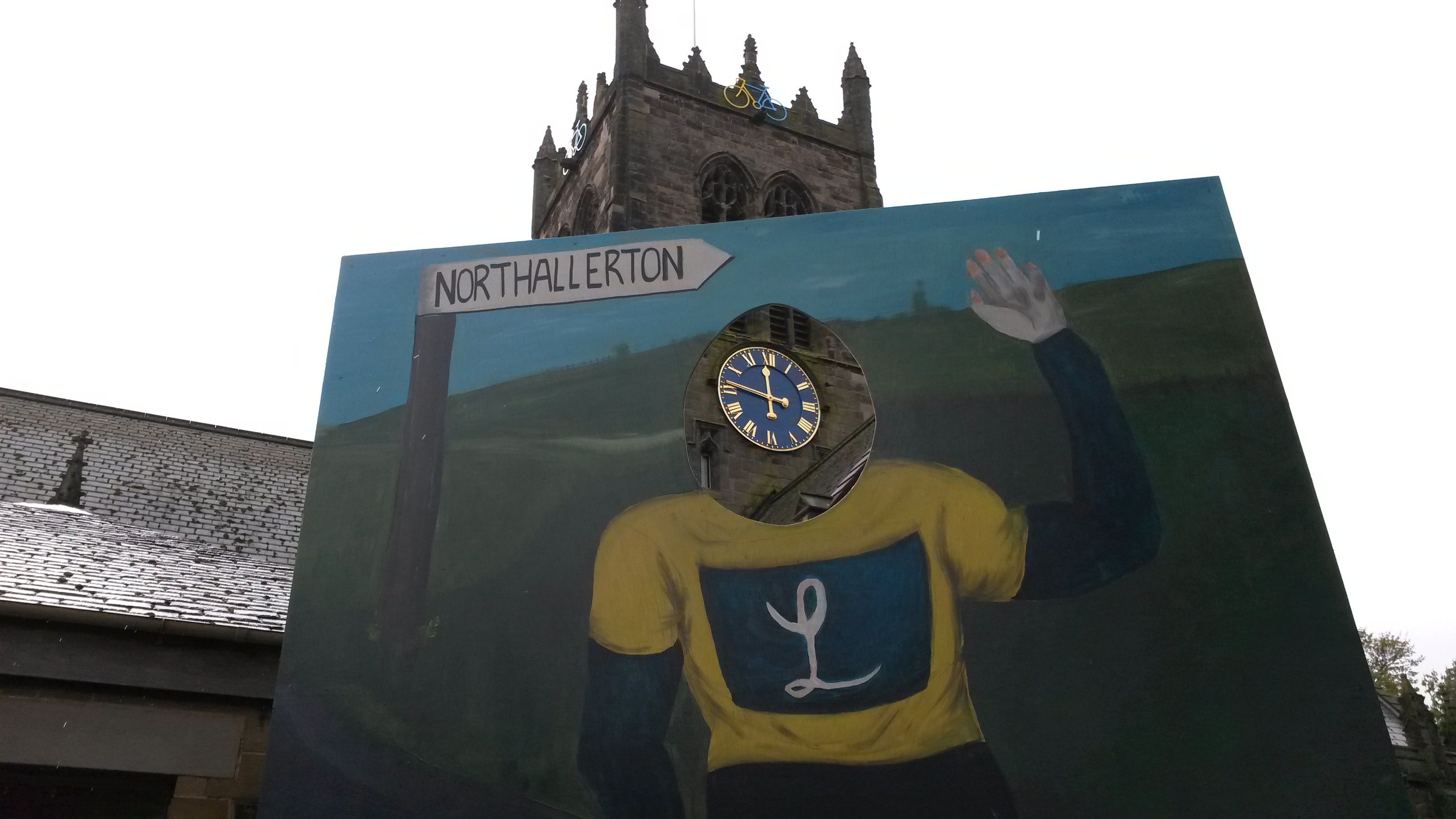 Mixed weather today, but no let up in the roadside decorations. Northallerton moved a whole fairground for the race on the high street, while Sutton Under Whitestonecliffe and Sutton Bank had bunting to rival the 25% slopes of the climb.